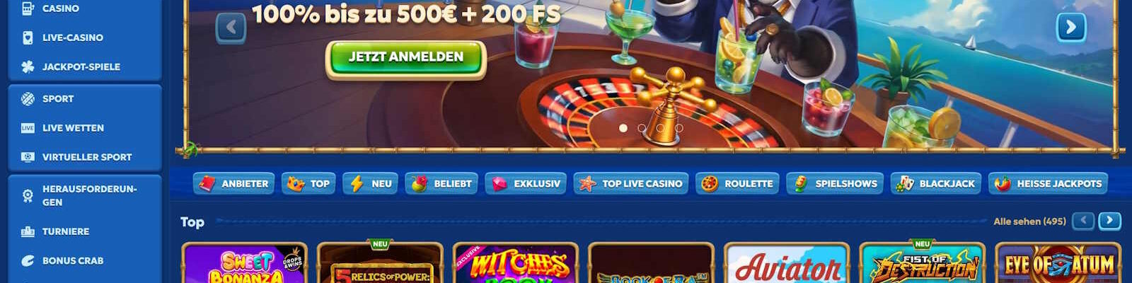 | Bonus | Willkommensbonus bis 500 € + 200 Freispiele + Bonus Crab |